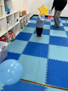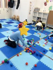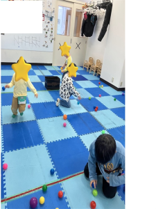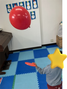 運動遊びでは、風船バトミントンをしたり、玉入れをしたり