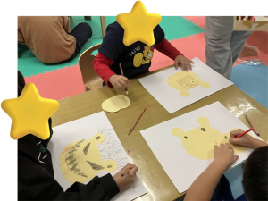 はじめに、ライオンとフクロウのお顔を色えんぴつで描きました。