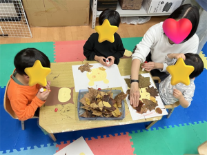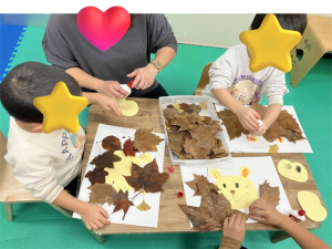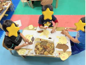 その後は、いろんな形や大きさの落ち葉の中から好きなものを選んで貼っていきましたよ😊