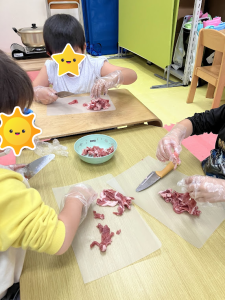 包丁を使う時にはケガのないように慎重にお肉を切っていましたよ。