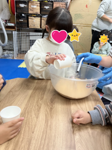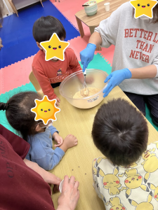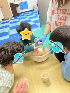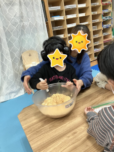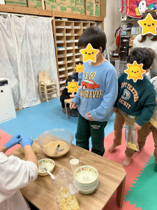 きな粉が苦手なお友だちもいましたが、みんなと一緒に作る楽しさを知り、『食べてみようかな?』と苦手な食材にも挑戦して食べることで「おいしい~😋」『食べてみてよかったよ😊』『おかわりしよう』というお友だちもいましたよ。