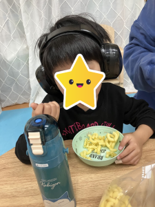昨日の活動のクッキングはマカロニきな粉を作りました。