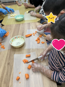まずはにんじんを切る係🥕お肉を切る係に分担をして行いました。