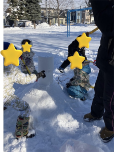 みんなで大きな山を作ったあと、バケツに雪をギューギューに詰め込んで山のてっぺんに乗せるとなんとかお顔になり、歓声が上がりました😊