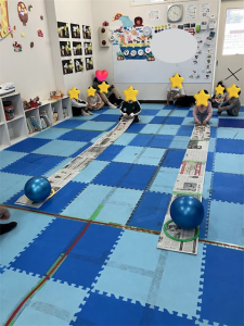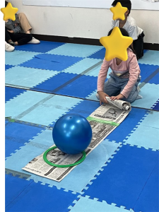 長く繋げた新聞紙の上にボールを置いて、転がっていかないように手繰り寄せるというルールで行いました。
